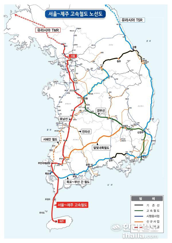 전라남도가 26일 도청 브리핑룸에서 건의문 발표를 통해 철도 르네상스 시대 실현과 국가 균형발전을 앞당길 '서울-제주 고속철도 건설'을 제20대 대통령 공약으로 반영할 것을 건의했다. 사진은 전라남도가 제시한 서울~제주 고속철도 노선도. 사진=전남도청 제공