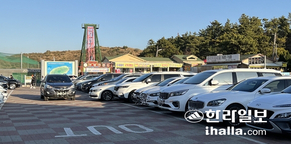 | 1일 찾은 서귀포시 안덕면 용머리 관광지 주차장에는 빈 공간을 찾아보기 힘들정도로 관광객 차량들로 북적이고 있다. 이태윤기자 |