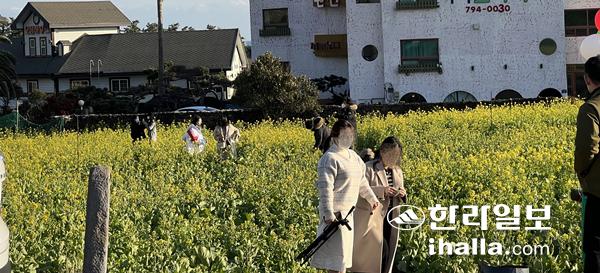 설날인 지난 1일 서귀포시 안덕면 산방산 인근 유채밭 갓길에는 관광객들이 타고 온 차량들이 빼곡하게 주차돼 있고, 관광객들은 유채밭에서 노랗게 핀 유채꽃을 배경으로 기념촬영에 한창이었다. 산방산 공영주차장에는 빈 주차 공간을 찾아보기 힘들었고 용머리, 중문해수욕장 등 도내 주요 관광지에도 관광객들로 북적였다.