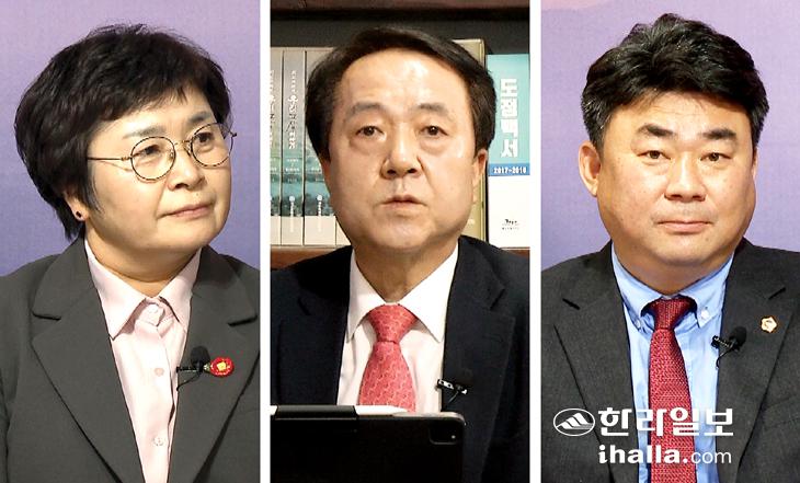 사진 왼쪽부터 강성의 제주특별자치도의회 의원, 김태윤 제주와미래연구원 수석연구위원, 강충룡 제주특별자치도의회 의원