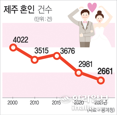 통계청이 17일 발표한 '2021년 혼인·이혼 통계'를 보면 작년 제주지역 혼인건수는 2661건으로, 관련 통계가 지역별로 집계되기 시작한 1981년 이후 최저치로 집계됐다. 2017년(3654건) 이후 5년 연속 감소세이고, 사상 처음으로 3000건이 깨졌던 2020년(2981건)에 비해 10.7% 줄었다.