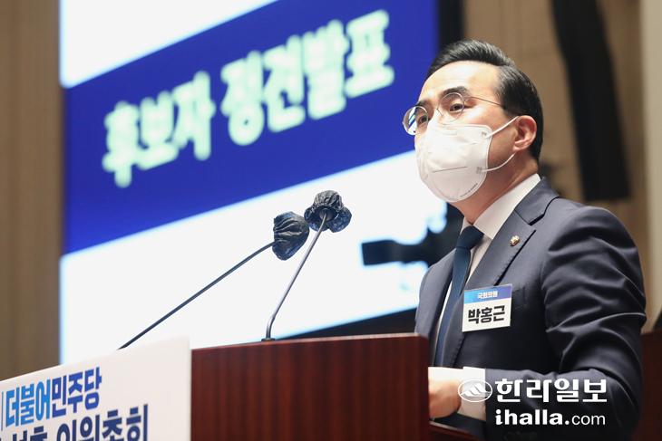 민주당 새 원내대표에 선출된 박홍근 의원. 사진은 24일 정견발표 모습. 연합뉴스