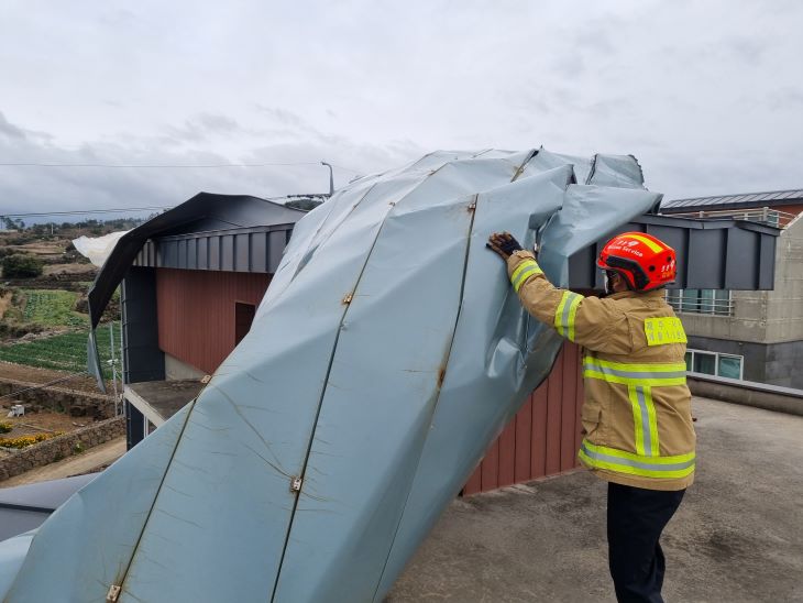 25일 제주시 애월읍 애월리에서 강풍에 파손된 건물 지붕을 소방대원이 안전조치 하고 있다. 제주소방안전본부 제공