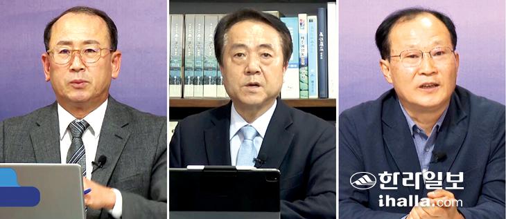 사진 왼쪽부터 고대로 한라일보 부국장, 김태윤 제주와미래연구원 수석연구원, 고기원 곶자왈공유화재단 이사 겸 연구소장