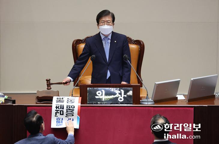 국민의힘은 민주당과 박병석 국회의장이 일방적으로 법안 표결을 강행한다고 항의하며 표결에 참여하지 않았다. 다만 본회의장에서 퇴장하지는 않았다.