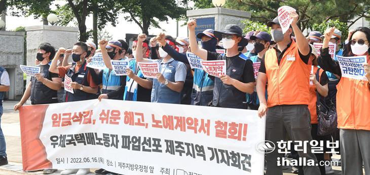 한편 제주 우체국택배 노동자들도 지난 16일 "우정사업본부가 제시한 새 계약서는 쉬운 해고를 위한 계약정지, 계약해지 조항이 담긴 노예계약서"라고 규탄하며 파업 동참을 예고했었다.