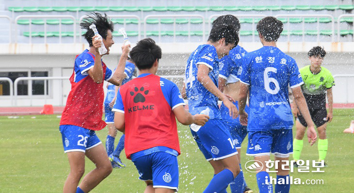 | 26일 제주종합경기장 주경기장에서 열린 제5회 제주도축구협회장기 전도축구대회 남고부 결승전에서 대기고를 3-2로 물리친 제주제일고 선수들이 물병의 물을 뿌리며 기쁨을 나누고 있다. 이상국 기자 |