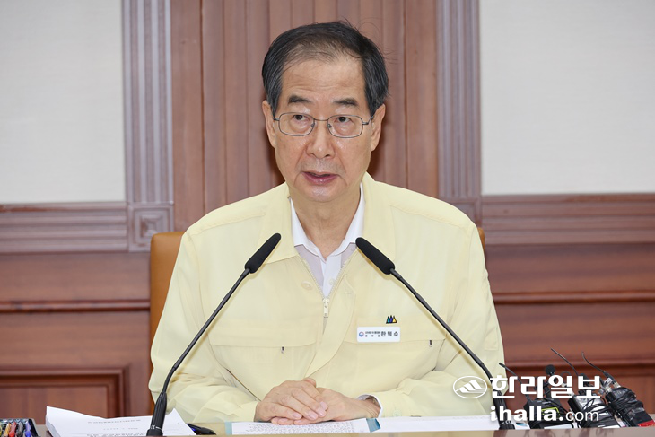 | 한덕수 국무총리가 13일 정부서울청사에서 열린 코로나19 대응 중앙재난안전대책본부 회의를 주재하고 있다. 연합뉴스 |