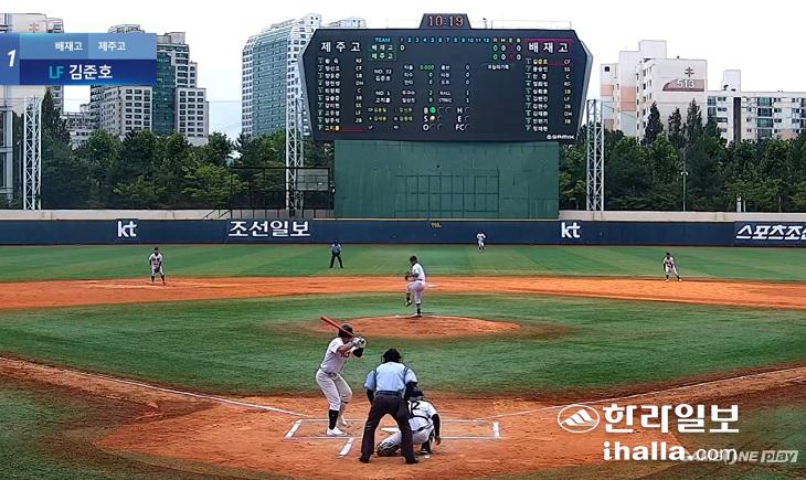 지난 14일 서을 목동야구장에서 열린 청룡기 전국고교야구선수권대회 겸 주말리그 왕중왕전 제주고와 배재고의 경기장면 캡처. 대한야구소프트볼 협회 제공