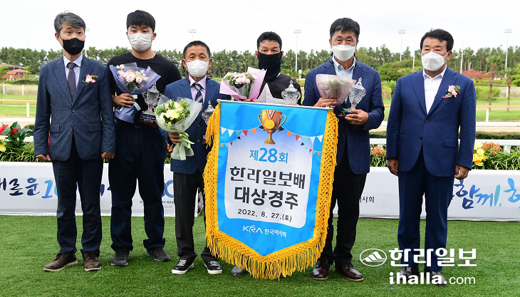 27일 제주경마공원에서 열린 제28회 한라일보배 대상경주에서 시상식에서 우승마와 함께 대상경주 관계자들이 기념촬영을 하고 있다. 강희만 기자
