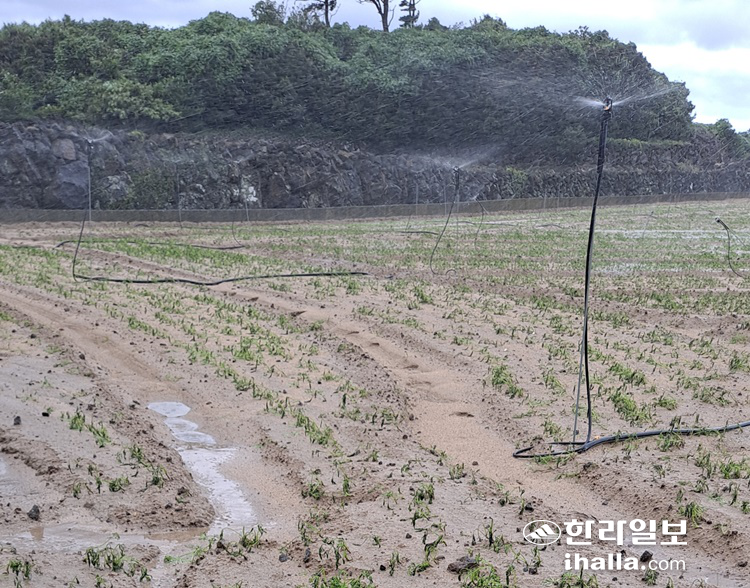 | 6일 구좌읍 지역에서 농가들이 조풍 피해를 입은 당근밭에 스프링클러를 돌리고 있다. 문미숙기자 |