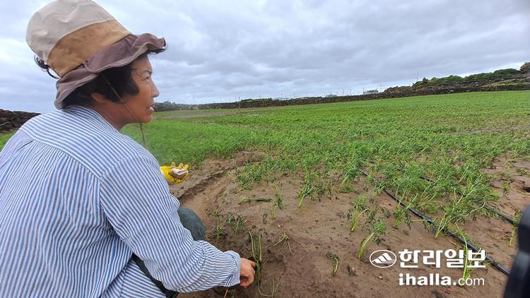 이성여(69·구좌읍)씨는 "당근 걱정에 정전까지 발생해 밤새 잠을 설치다 오전에 밭에 나와 보니 조풍 피해가 크다"며 "7월 24일 파종했는데 일부는 강풍에 뿌리가 돌고 토양이 유실되며 뿌리가 노출된 당근들도 있는데, 살아난다 해도 당근이 곧게 자라지 않아 상품성이 크게 떨어지고 생산량도 줄어들게 된다"고 걱정했다. 그는 "그래도 피해를 조금이라도 줄여보려 아들과 함께 스프링클러를 돌리려고 준비중"이라고 했다.