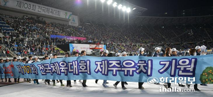 7일 울산종합운동장에서 열린 제103회 전국체육대회 개회식에서 제주특별자치도선수단이 2026년 제107회 전국체육대회 제주개최 유치 기원을 적은 플래카드를 들고 차기개최지 전남에 이어 두 번째로 입장하고 있다.