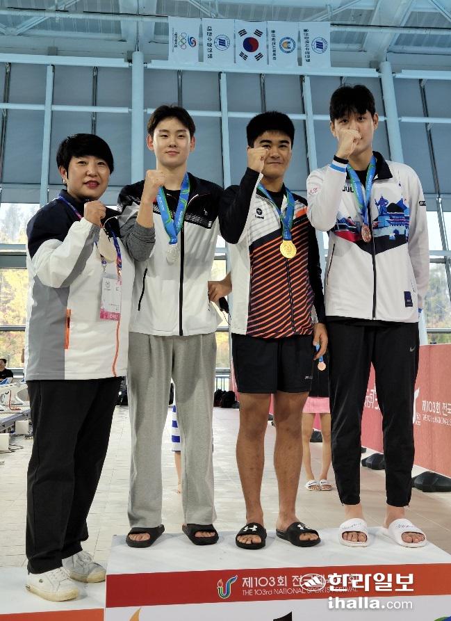 8일 울산 문수실내수영장에서 열린 남자 19세이하부 다이빙 스프링보드 3m 시상식에서 홍인숙 제주도의회 문화관광체육위원회 부위원장이 우승을 차지한 박지혁(가운데) 등에게 시상하고 기념촬영을 하고 있다.