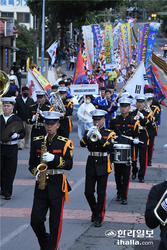 경연심사가 진행된 탑동해변공연장까지 약 1시간 30분간 이어진 행렬은 각 마을 민속보존회가 선보인 흥겨운 풍물놀이와 퍼포먼스로 도민과 관광객의 눈과 귀를 사로잡았다.