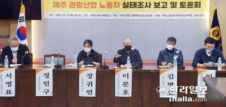 민주노총 서비스연맹 제주본부와 관광레저산업노동조합 제주본부는 13일 제주도의회 대회의실에서 '제주 관광산업 노동자 실태조사 보고 및 토론회'를 열었다. 이상국기자