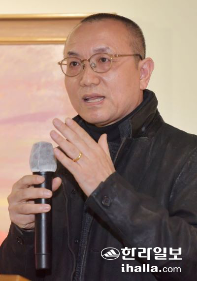 18일 한라일보 주최, 한라일보·이룸갤러리가 주관하는 채기선 작가 초대전 '한라산'의 막이 올랐다. 이날 한라일보 1층 갤러리ED에서 열린 전시 오프닝 행사에서 채기선 작가가 관람객들에게 작품을 설명하고 있다. 이상국기자