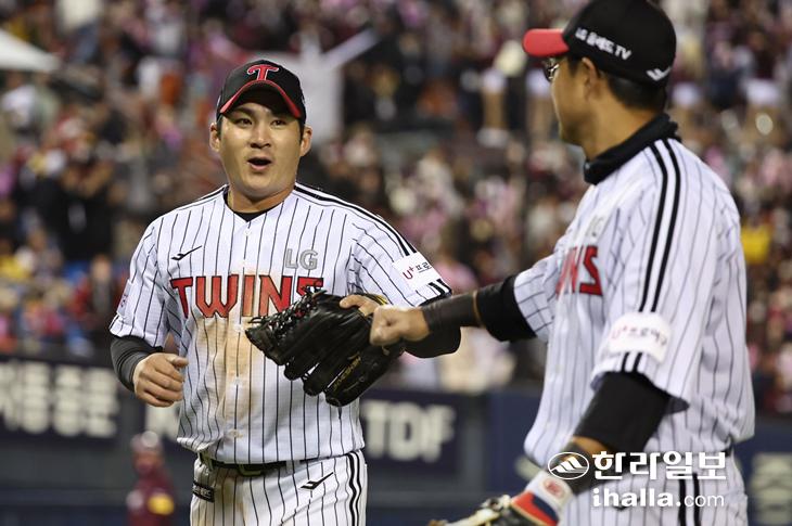 24일 서울 잠실야구장에서 열린 2022 프로야구 플레이오프 1차전 키움 히어로즈와 LG 트윈스의 경기. 8회초 1사 3루 상황 키움 푸이그를 땅볼 아웃으로 처리한 LG 유격수 오지환이 동료선수들과 하이파이브를 하고 있다. 연합뉴스