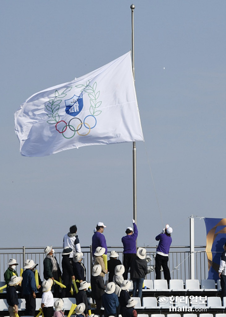 | 28일 오후 서귀포시 강창학경기장에서 열린 제56회 제주특별자치도민체육대회 개회식에서 대회기 게양되고 있다. 이상국 기자 |