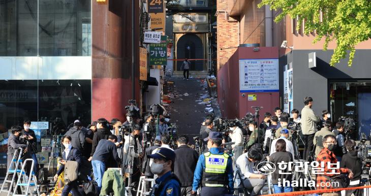 30일 서울 용산구 이태원동 '핼러윈 인파' 압사 사고 현장 부근에 취재진이 대기하고 있다. 연합뉴스