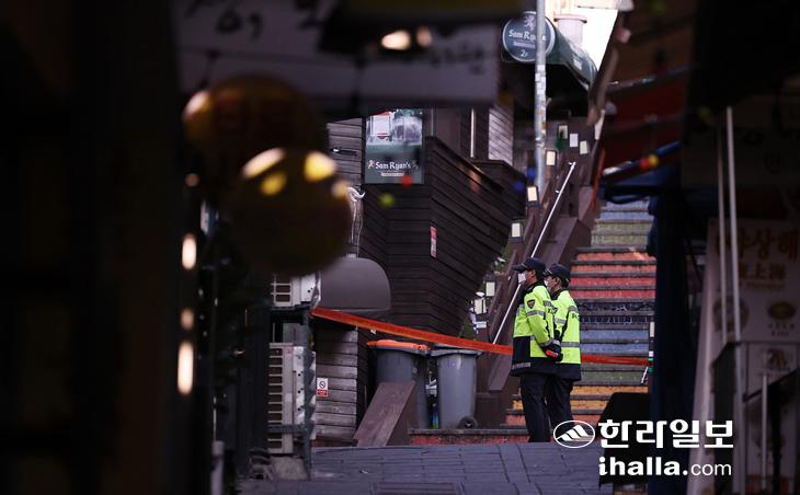 31일 오전 경찰 관계자들이 서울 용산구 이태원 세계음식문화거리 출입을 통제하고 있다. 연합뉴스
