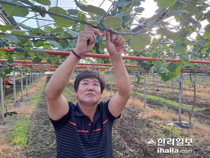 신태범 성산일출봉농협키위공선회장이 성산키위특화단지에 있는 자신의 키위농장에서 가지 등을 정리하며 내년에 풍성한 수확과 함께 안정적 고수익을 희망하고 있다. 백금탁기자