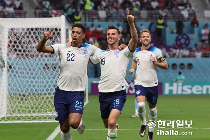 21일 오후(현지시간) 카타르 도하의 칼리파 인터내셔널 스타디움에서 열린 2022 카타르 월드컵 조별리그 B조 1차전 잉글랜드 대 이란 경기. 선제골을 넣은 잉글랜드의 주드 벨링엄이 메이슨 마운트와 환호하고 있다. 뒤쪽은 해리 케인. 연합뉴스