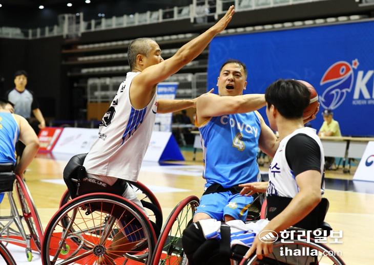 지난 7월 31일 서수원 칠보체육관에서 열린 2022 KWBL 휠체어농구리그 제주삼다수와 코웨이의 경기에서 제주의 조현석이 코웨이의 김호용의 공격을 차단하고 있다. 한국휠체어농구연맹 제공
