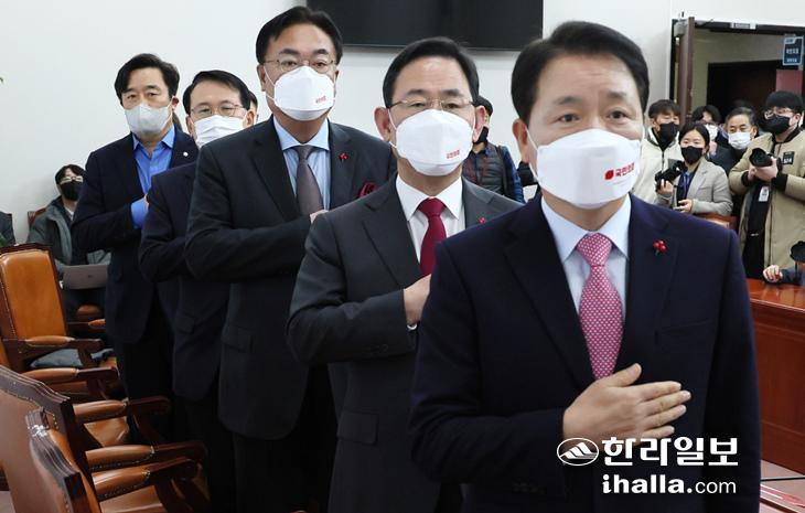 국민의힘 정진석 비상대책위원장이 23일 오전 국회에서 열린 제6차 전국위원회에서 국기에 경례하고 있다. 왼쪽부터 정동만 전국위 부의장, 윤두현 전국위 의장 직무대행, 정 비대위원장, 주호영 원내대표, 성일종 정책위의장. 연합뉴스