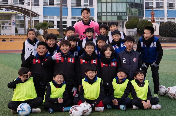 제주유나이티드에 입단한 김형근이 서귀포초등학교 선수들과 입단기념촬영을 하고 있다.