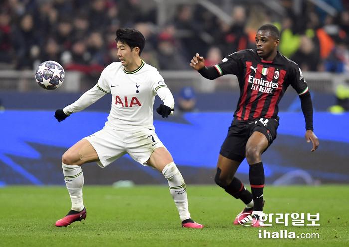 15일 열린 AC밀란과의 유럽축구연맹(UEFA) 챔피언스리그(UCL) 16강 1차전에서 고군분투하는 손흥민(왼쪽). 연합뉴스