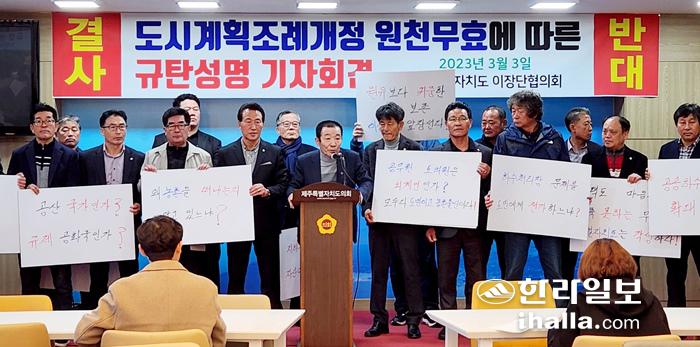 제주자치도이장단협의회(회장 장봉길)는 3일 오전 제주자치도의회 도민카페에서 기자회견을 갖고 "인구유입을 통해 마을 살리려는 농촌주민들의 꿈과 미래를 좌절시키는 불량규제를 담은 도시계획조례 개정안에 반대하며 즉각 폐기하라"고 요구했다.