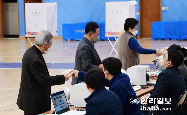 제3회 전국동시조합장선거일인 8일 선거인들이 제주시 한라체육관 보조경기장에 마련된 오라동 투표소를 찾아 투표하고 있다. 강희만기자