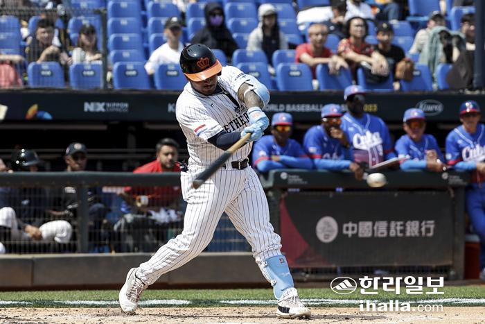 8일 대만 타이중 인터콘티넨털 구장에서 막을 올린 2023 WBC A조 본선 1라운드 대만과의 1차전에서 2타점 중전 적시타 친 네덜란드 트롬프. 연합뉴스