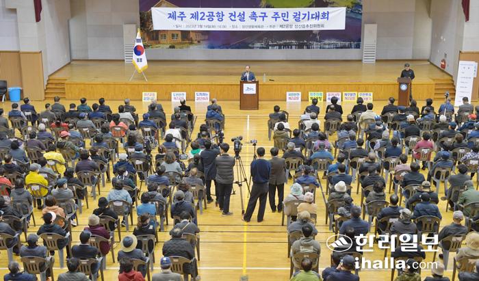 제2공항 성산읍추진위원회는 14일 성산생활체육관에서 성산읍과 표선면 찬성 측 주민 등 500여명이 참석한 가운데 '제주 제2공항 건설 촉구 주민궐기대회'를 개최했다. 이날 참석자를 대상으로 하는 서명운동도 벌였다.
