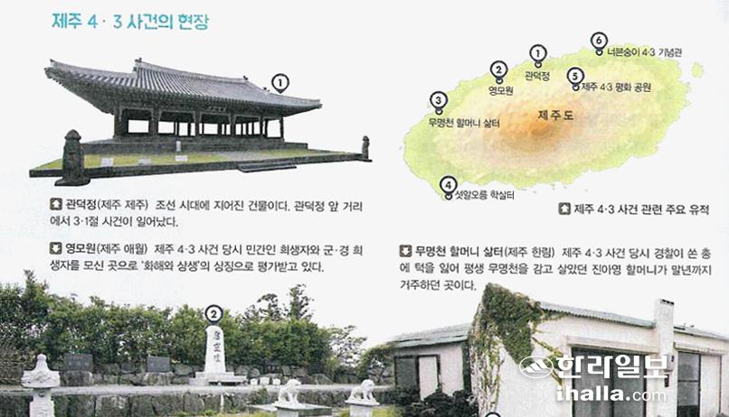 고등학교 검정 한국사 교과서의 '8·15 광복과 통일 정부 수립을 위한 노력'으로 다룬 내용 중 일부다. 적게는 1쪽, 많게는 3쪽 분량으로 4·3사건이 서술된 교과서는 전국의 청소년들에게 70여년 전 제주에서 벌어진 비극의 참상을 일깨우고 있다. 과거 250자 정도의 짧은 서술로 4·3을 '폄하'했던 것에 비하면 큰 변화다. 하지만 정권이 바뀔 때마다 교과서 속 4·3이 축소되거나 왜곡될 수 있는 상황이 전개되면서 확대, 지속을 위한 노력은 여전한 과제다.