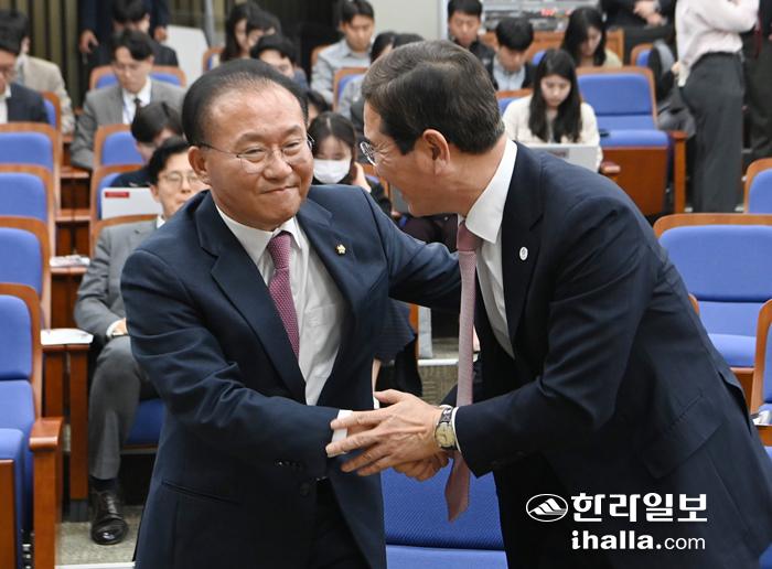 국민의힘 윤재옥 신임 원내대표(왼쪽)가 7일 오전 국회에서 열린 국민의힘 원내대표 선출을 위한 의원총회에서 당선 확정 후 김학용 후보의 축하를 받고 있다.연합뉴스