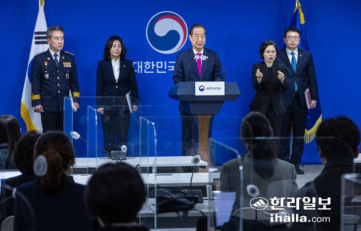 한덕수 국무총리가 12일 오후 서울 종로구 정부서울청사에서 학교 폭력 근절 대책을 발표하고 있다. 연합뉴스