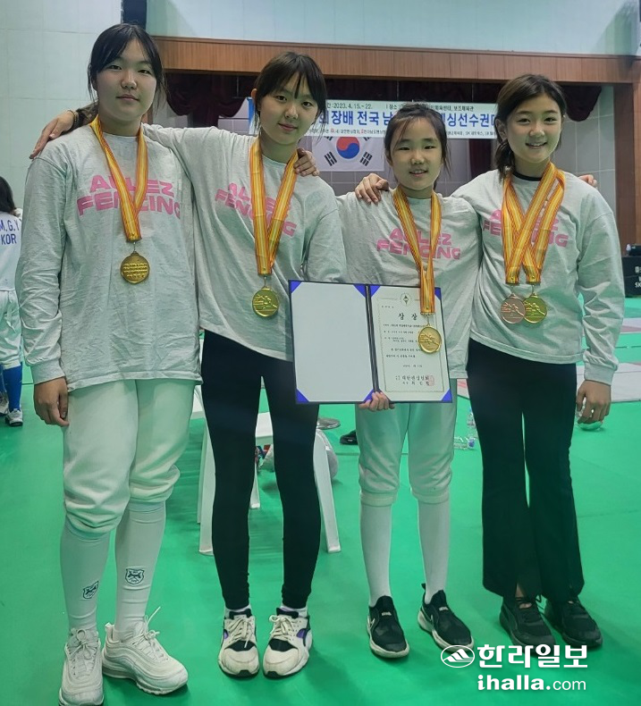 여자 초등부 에페 단체전에서도 박시연(브랭섬홀 아시아), 양리나(한국국제학교 제주캠퍼스), 정혜윤, 정윤아(세인트존스베리아카데미 제주)가 나서 사직초등학교와 접전 끝에 45-41로 승리하며 정상을 정복했다.