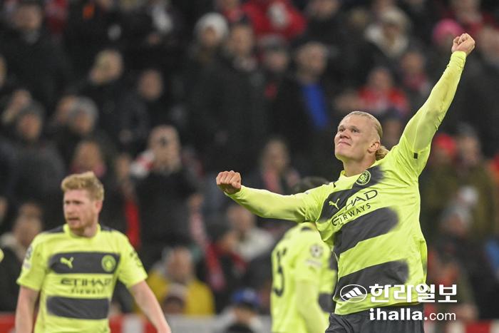 맨시티는 20일(한국시간) 독일 뮌헨의 알리안츠 아레나에서 열린 2022-2023 UCL8강 2차전에서 후반 12분 터진 엘링 홀란의 선제골을 끝까지 지키지 못해 바이에른 뮌헨(독일)과 1-1로 비겼다.