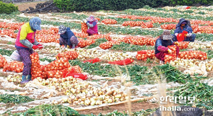 | 한경면 한 밭에서 양파 수확작업중인 외국인 노동자들. |