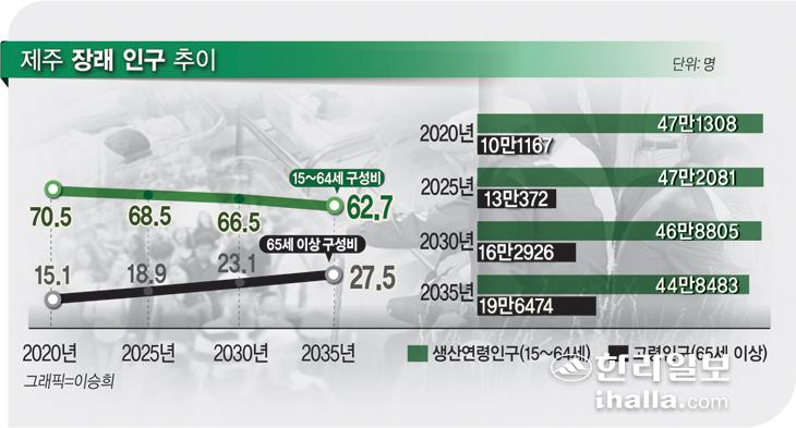 제주의 인구 전망 역시 녹록지 않다. 제주도 장래인구추계를 보면 전체 인구 대비 생산 연령 인구(경제 활동 인구)의 구성비는 2020년 전체 인구의 70.5%에서 2025년 68.5%, 2030년 66.5%, 2035년 62.7%, 2040년에는 57.7%까지 떨어진다. 반면 65세 이상 고령인구는 2020년 15.1%에서 2025년 18.9%, 2030년 23.1%까지 오르고 2035년 27.5%, 2040년엔 31.9%까지 갑절 이상 오르게 된다. >> 그래픽 참조