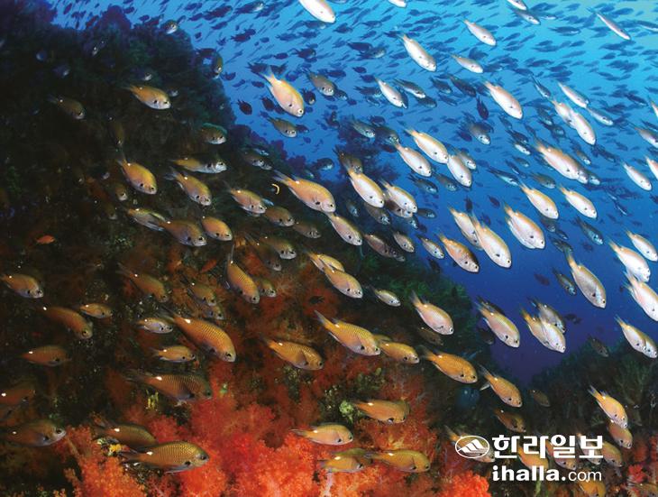 아직 자리돔은 제주 바다 어디서나 잘 관찰된다. 하지만 해역마다 자리돔의 특성도 다르고 자원량은 감소하고 있다는 이야기가 나오니 면밀한 조사가 필요하다. (김광회 제공)