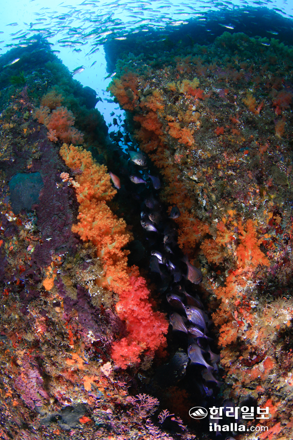 | 제주 바다의 전형적인 절벽은 아니나 그 특성을 잘 나타낸다. 바위 표면에 큰 해조류는 없고, 연성 산호를 비롯한 무수히 많은 동식물이 사는 것을 확인할 수 있다. (조은진 사진 제공) |