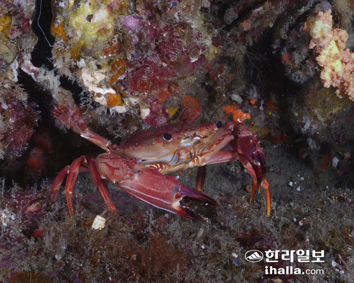 | 홍색민꽃게가 살던 바위굴에서 살짝 나왔다. 굴 주변 바위에는 홍조류, 히드라충류, 멍게류, 해면동물, 이끼벌레 등이 가득하다. (조은진 사진 제공) |