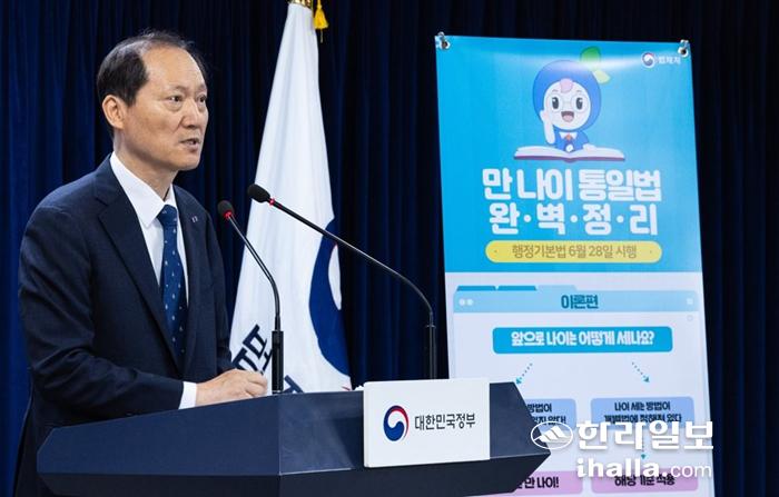 이완규 법제처장은 이날 정부서울청사 브리핑에서 "'만 나이 통일법'은 그동안 나이 기준 혼용으로 인해 불필요하게 발생했던 사회적 비용을 크게 절감하는 효과가 있다"고 설명했다.