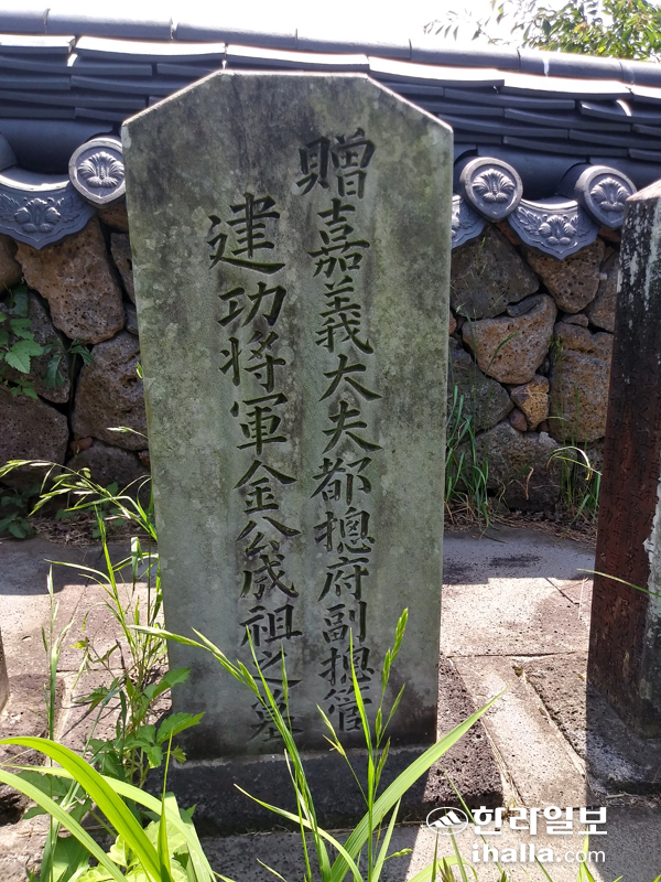 | 제주시 애월읍 고내봉에 조성된 나주김씨입도조성역에 놓인 건공장군 김성조 묘비. 진선희기자 |