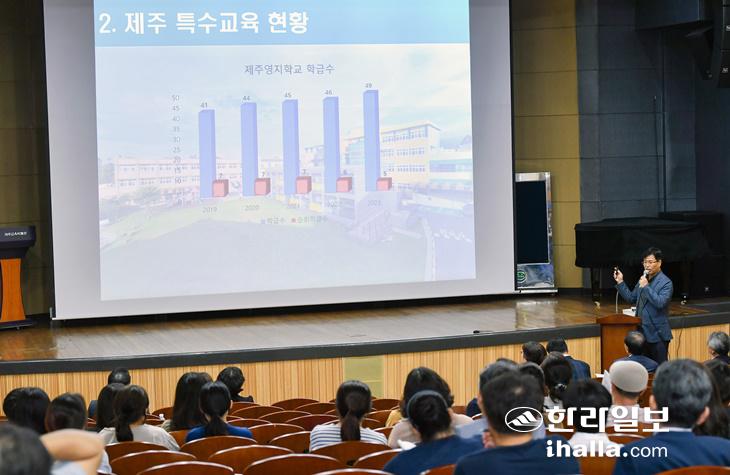 4일 제주도교육청 주최로 제주교육박물관에서 열린 '제주특수교육원 설립·운영 방안' 공청회에서 제주 특수교육 실태와 현황을 발표하고 있다.제주도교육청 제공