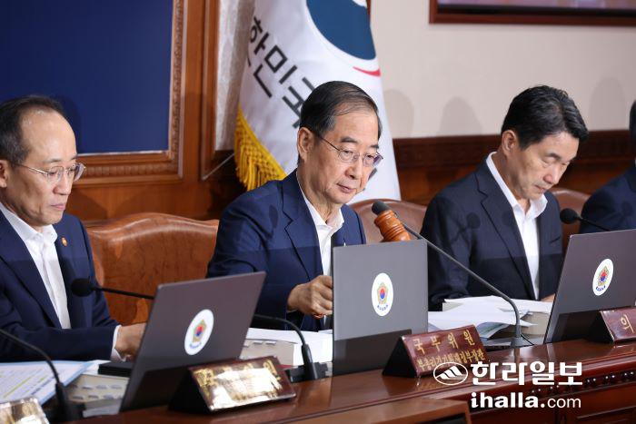 한덕수 국무총리가 11일 정부서울청사에서 열린 국무회의에 참석해 의사봉을 두드리며 개회를 알리고 있다. 연합뉴스