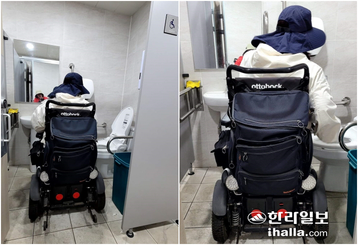 | 지난 5~6월 우도 여행에서 하우목동항 대합실 장애인 화장실을 찾았던 윤선 씨. 휠체어를 타고 들어가니 문이 안 닫히고 변기에 앉을 수도 없어 도로 나와야 했다. 전윤선씨 제공 |